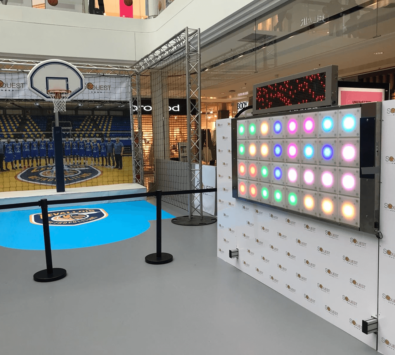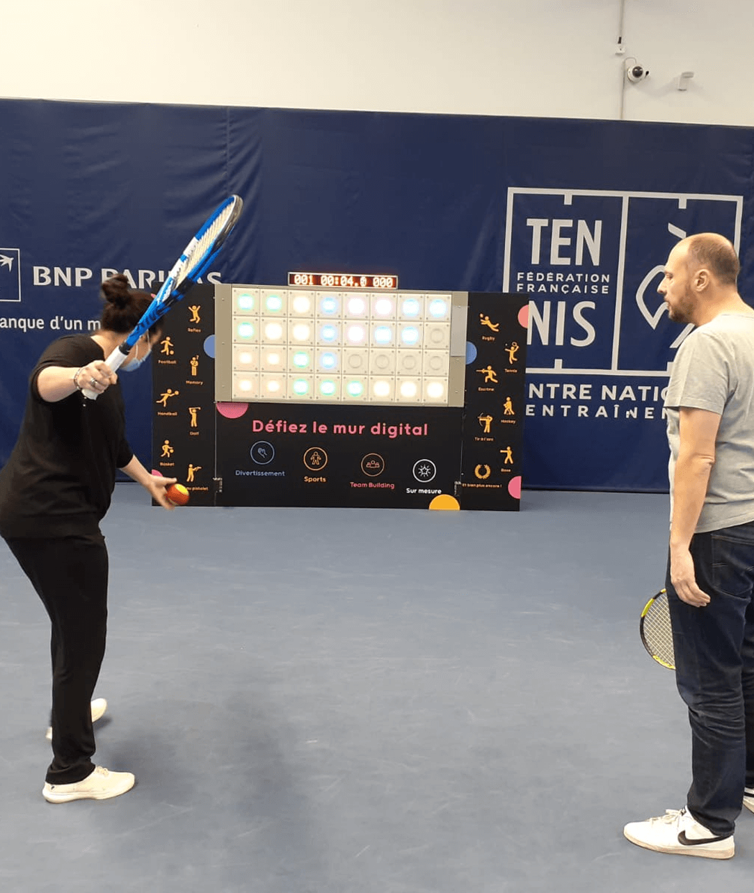 Nous adaptons des sports populaires comme le football, le tennis, le handball, le rugby, le basket, le golf, le padel, l'escrime et la boxe interactifs sur le mur. Cela peut inclure des défis de précision, des tests de réflexes, des épreuves d'agilité et des jeux de coordination.